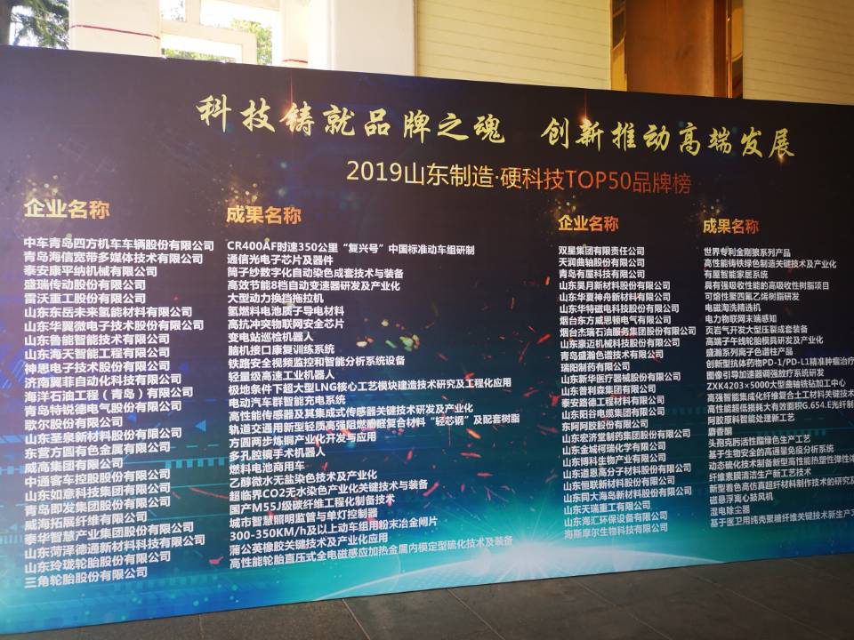 5月23日,“制造业高质量发展2019山东论坛暨山东制造·硬科技TOP50品牌榜发布仪式”在济南隆重召开,烟台东方威思顿电气有限公司“电力物联网末端感知”项目上榜。